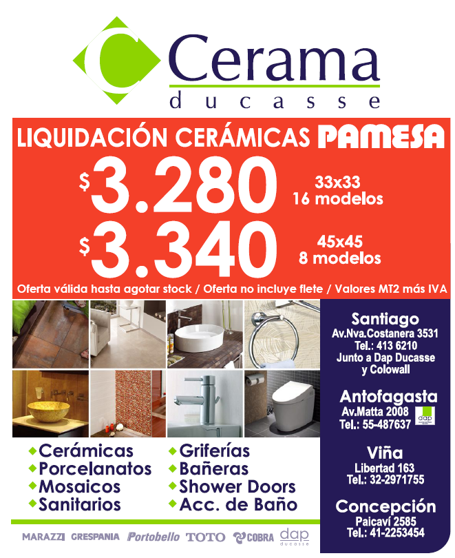 Esta oferta es válida para todas las tiendas de Cerama a nivel nacional: Santiago (Vitacura y Apoquindo), Antofagasta, Viña del Mar y Concepción. La oferta No incluye el valor de los fletes al solicitar los despachos.